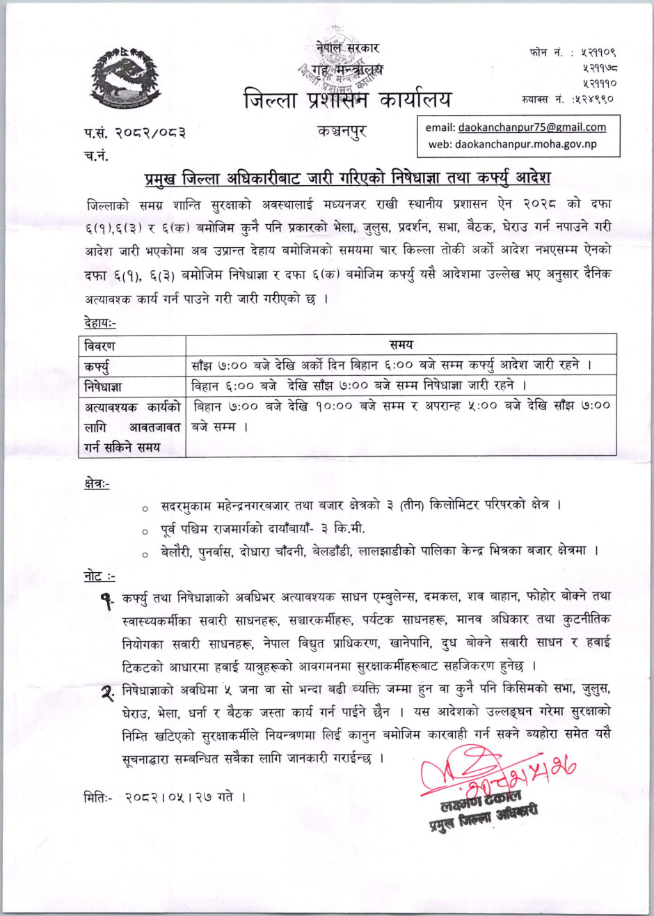 प्रमुख जिल्ला अधिकारीबाट जारी गरिएको निषेधाज्ञा र कर्फ्यु आदेश
