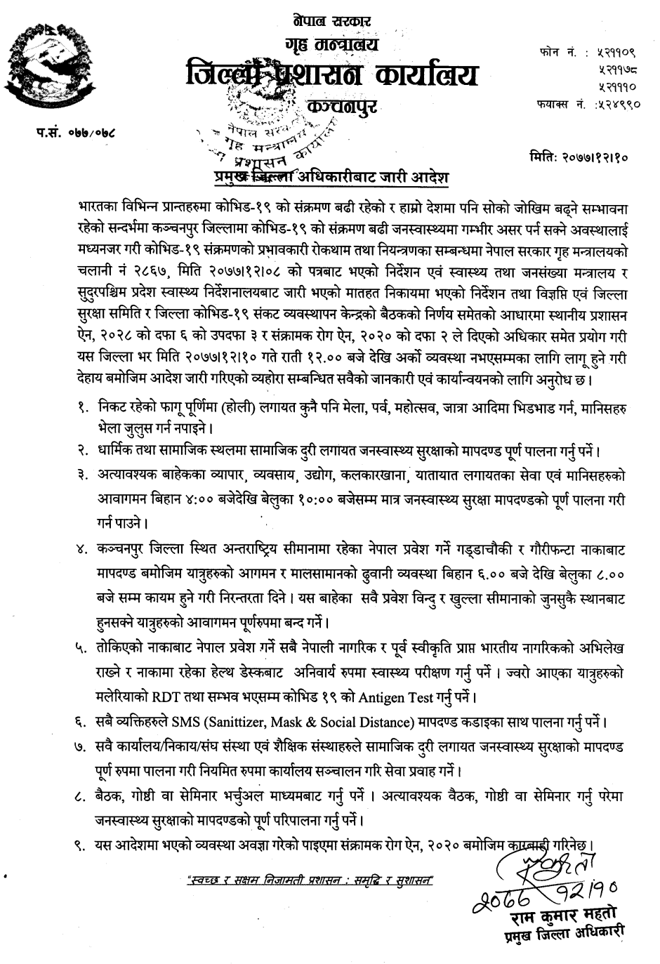 प्रमुख जिल्ला अधिकारीबाट मिति २०७७/१२/१० गते जारी भएकोआदेश।