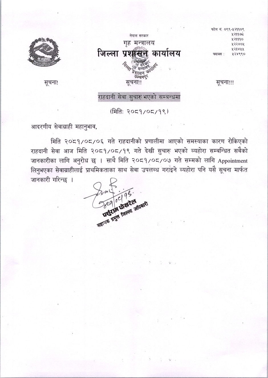 राहदानी सेवा सुचारु भएको सूचना !