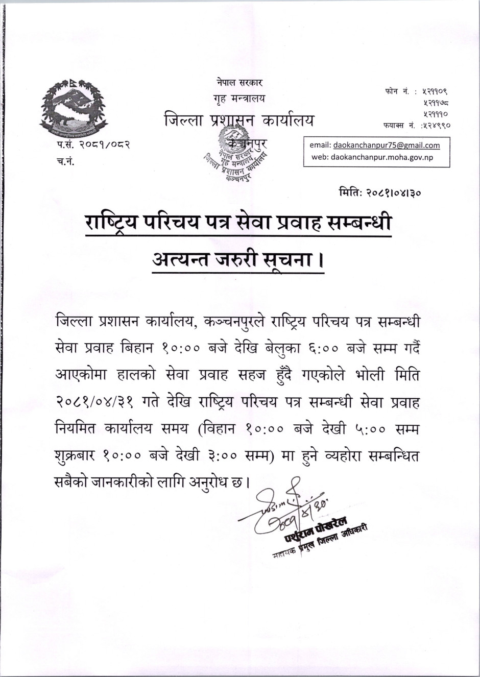 राष्ट्रिय परिचयपत्र सेवा प्रवाह सम्बन्धी अत्यन्त जरुरी सूचना