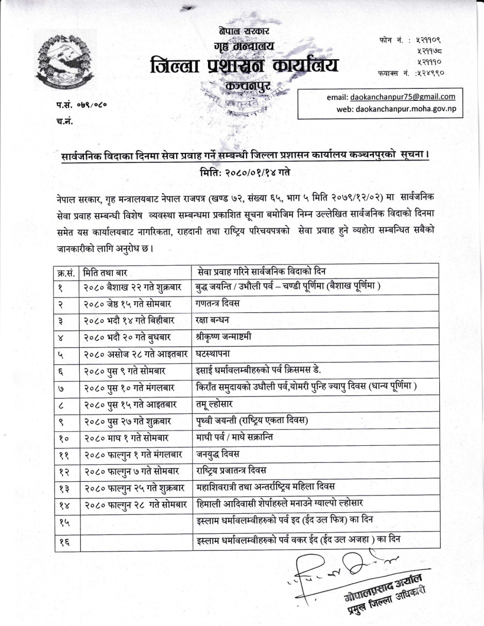 सार्वजनिक विदाका दिन सेवा प्रवाह सम्बन्धी सूचना ।।